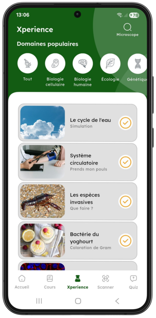 Visualisation interactive de concepts abstraits (photosynthèse, mitose, écosystèmes). Des simulations manipulables remplacent les schémas statiques. L’élève peut tester des hypothèses et observer les conséquences en temps réel.